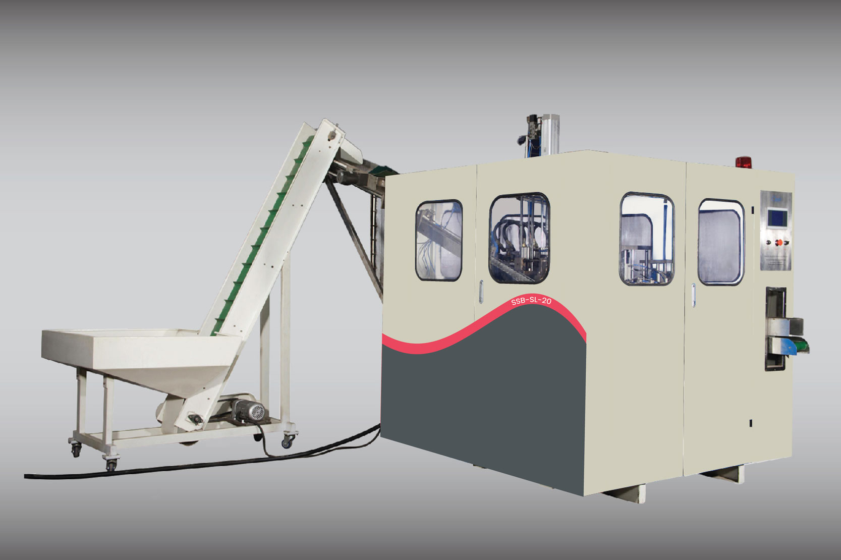 In the SSB 05 and SSB 20C series performs have to be loaded by the operator into the mould neck area. This is strenuous and time consuming compare to the SSB – D series which requires the operator to drop the preform into preform carriers or neck slots. The pneumatically operated neck slot or preform carrier transfer the preform into the mould and come back during blowing cycle to be replenished, there by saving valuable cycle time. The preform discharge track as well as the preform loading carriers is designed in such a way they are in the same level so as to support easy and comfortable working for the operator.
