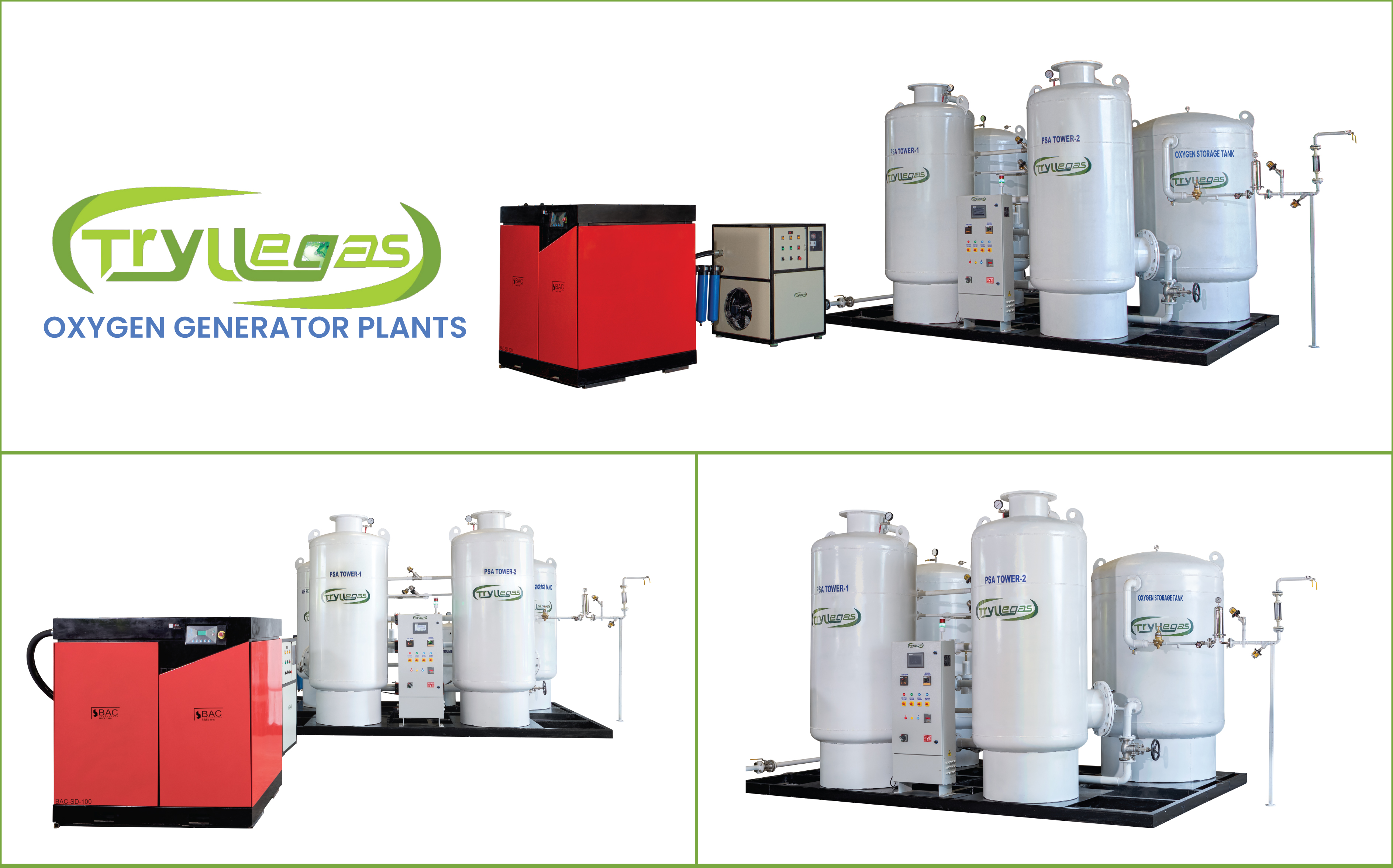 93 ± 3% OXYGEN PURITY - SAFE FOR MEDICAL USE USP requirements − ‘Oxygen 93 Percent’ contains not lesser than 90% or not more than 96% by volume, of Oxygen, the remainder consisting mostly of argon and nitrogen gases. Meets the requirement of identification, Odor, CO2 not more than 0.03%, and CO not more than 0.001% in gas. Tryllegas's Oxygen Generator Plant system is fabricated in accordance with all relevant codes Like ASME, ANSI, NEMA, CE Standards, Medical Oxygen Generators are built to confirms to the United States Pharmacopeia (USP) Oxygen 93% Monograph and also confirms to ISO−10083.